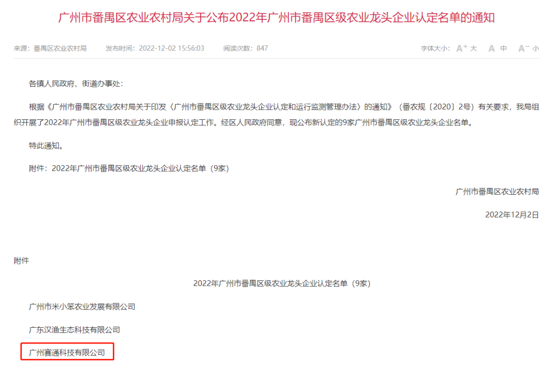 本次獲評“番禺區級農業龍頭企業”,廣州賽通科技有限公司將以科技創新全面助推鄉村振興建設、以自主研發助力當地農業產業現代化發展。