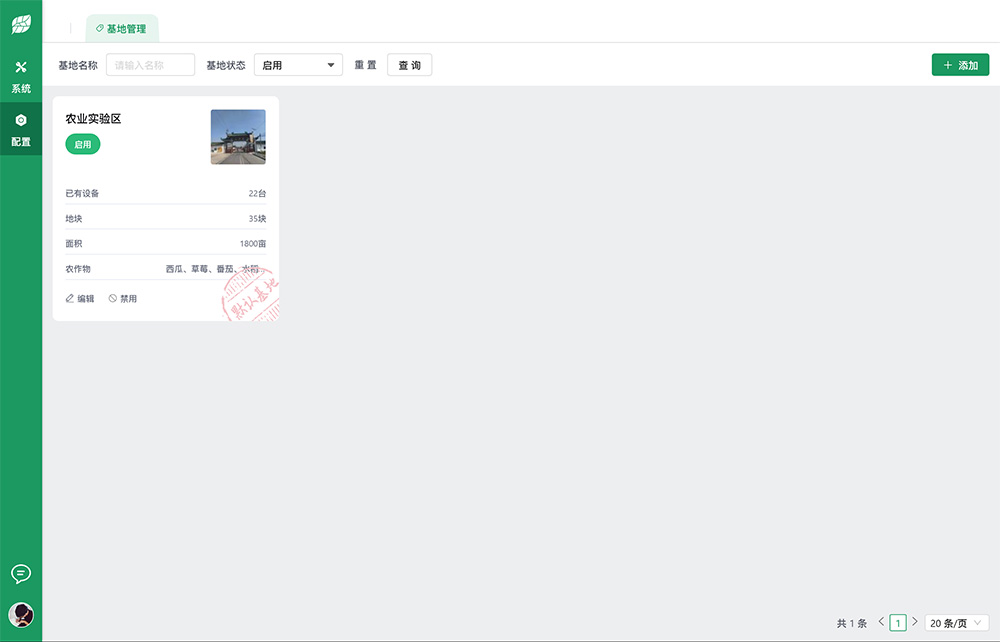 ◇ 配置管理:對企業所屬的基地、角色、作物、農事等進行統一維護管理和數據對接推送的開發配置。